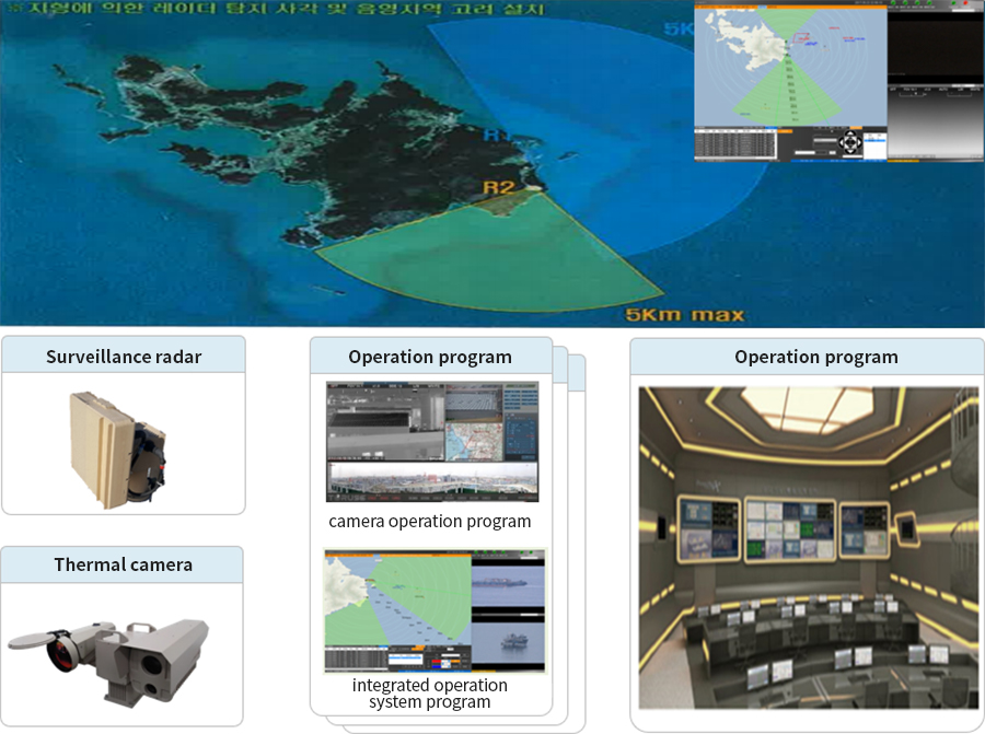 A system that monitors unidentified personnel and ships approaching the shore day and night. The system transmits the identification information of the detected target to the integrated control center in real time so that we can monitor it with the operator console.